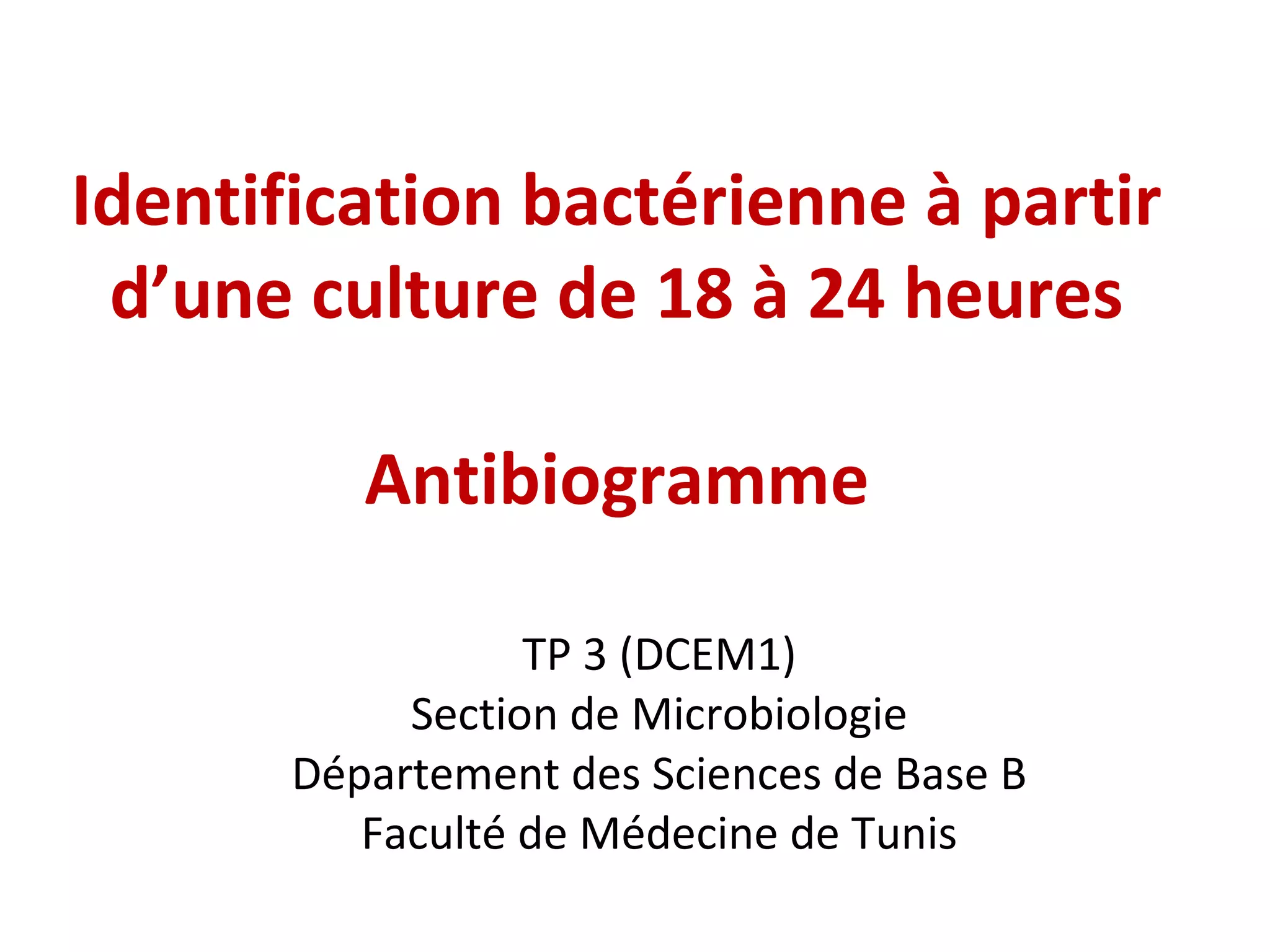 Le document décrit les méthodes d'identification bactérienne à partir de cultures, incluant l'analyse morphologique, culturale et biochimique. Il détaille également la réalisation d'un antibiogramme pour évaluer la sensibilité des bactéries aux antibiotiques, ainsi que les tests de résistance. Des démonstrations pratiques sont également prévues pour illustrer les techniques de laboratoire utilisées.
