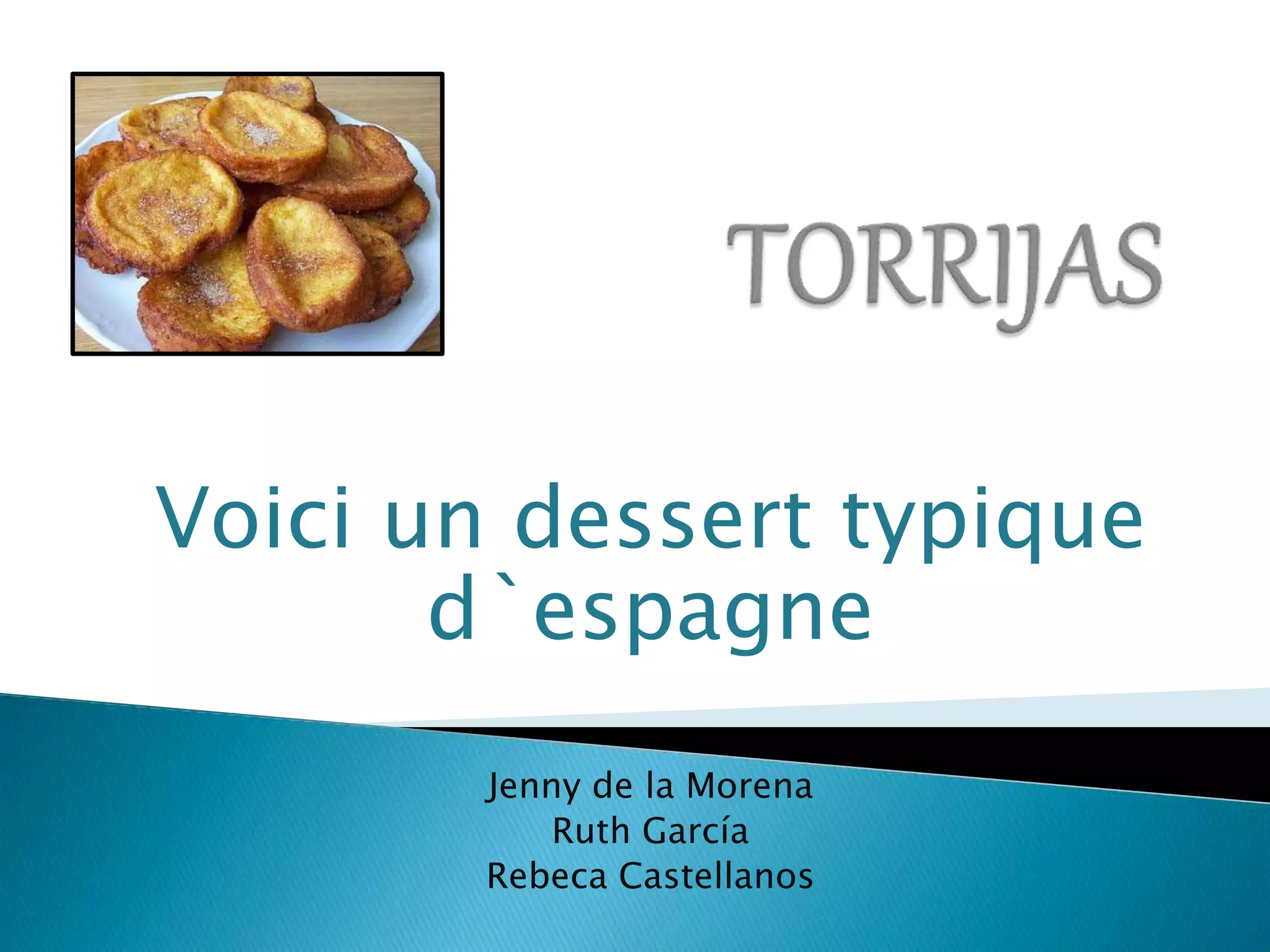 Ce document présente une recette d'un dessert typique espagnol à base de vieux pain, œufs, lait, sucre, vin blanc, miel et cannelle. Les étapes incluent la préparation d'un mélange pour tremper le pain et le frire, puis le service avec du sucre. Ce dessert est destiné à être partagé avec des amis.