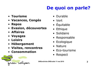 Le document aborde le tourisme durable, équitable et responsable, soulignant la croissance exponentielle du secteur depuis les années 1970, avec des thèmes tels que l'impact environnemental, les défis de la surconsommation et les disparités économiques. Il met en lumière la France comme première destination touristique mondiale, tout en discutant des enjeux liés aux ressources et à l'accueil touristique. Également, il décrit un paysage diversifié d'acteurs et de services dans le secteur, ainsi que la montée des nouvelles tendances et des comportements des touristes.