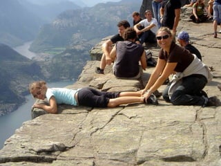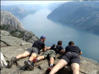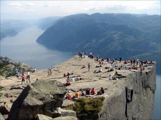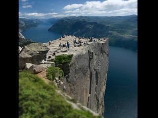 Le document décrit Preikestolen, une célèbre falaise norvégienne offrant des vues impressionnantes sur le fjord. Il évoque l'excitation et le frisson que ressentent les visiteurs en atteignant le sommet. Le texte souligne également les risques associés à cette expérience, notamment pour ceux qui ont le vertige.