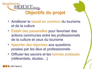 Le projet vise à améliorer la collaboration entre les professionnels du tourisme et de la culture pour favoriser des actions communes et partager des bonnes pratiques. Il met l'accent sur l'importance du tourisme culturel et l'utilisation de réseaux collaboratifs pour stimuler l'innovation et résoudre des problèmes de manière collective. Une première expérimentation a été réalisée pour initier le travail collaboratif, avec des productions telles qu'un vade-mecum du tourisme culturel et une liste de problématiques à aborder.