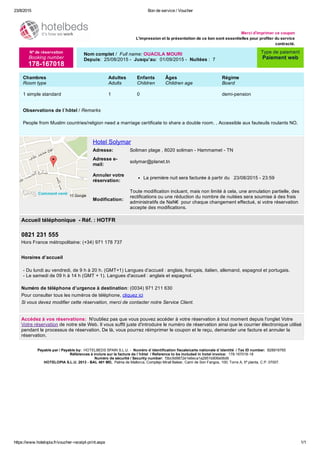 Le document est un bon de service pour une réservation à l'hôtel Solymar à Soliman plage, Tunisie, pour une durée de 7 nuits. Il contient des informations sur le numéro de réservation, les modalités d'annulation et de modification, ainsi que des détails sur le paiement et les contacts du service client. Le bénéficiaire doit imprimer ce bon pour profiter de son séjour.