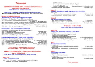 Le document présente le programme du 9ème congrès du GELEV sur l'échographie et les techniques laser, qui se tiendra au Centre Hospitalier Universitaire de Tours, axé sur des formations théoriques et pratiques. Il inclut des ateliers sur des thèmes variés tels que l'andrologie, la médecine vasculaire, et la chirurgie endovasculaire,le tout sous la présidence de professeurs reconnus. Les participants doivent s'inscrire à l'avance, avec des tarifs distincts pour les membres et les étudiants.