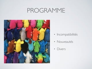 Le document présente les nouveautés et incompatibilités de PHP 7.4, y compris des changements dans la syntaxe, les propriétés typées, et les opérateurs. Il aborde également les performances améliorées et fournit des conseils pour la migration depuis des versions antérieures de PHP. Des exemples de code illustrent les modifications et les dépréciations de certaines fonctionnalités.