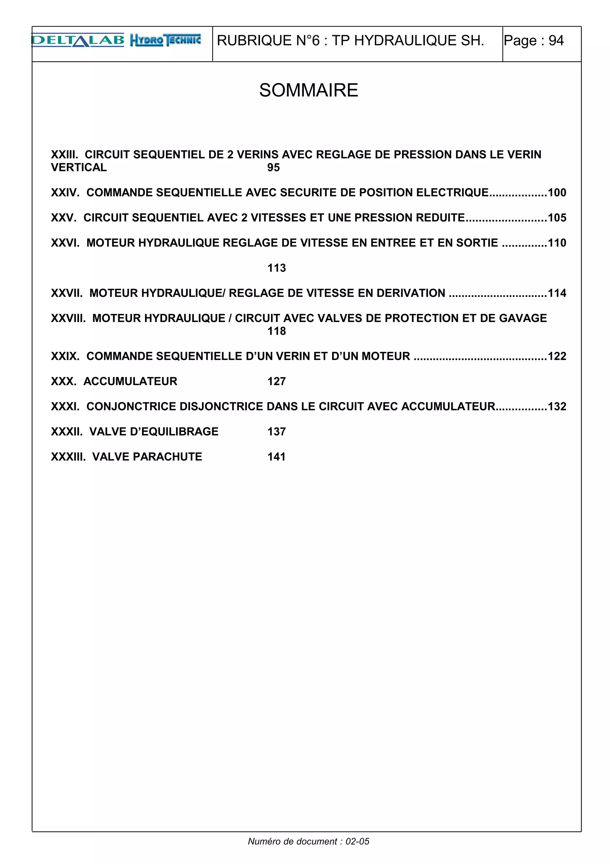 Le document traite des travaux pratiques en hydraulique, en présentant divers circuits séquentiels, leurs objectifs, les composants nécessaires, et les procédures à suivre. Chaque section détaille un type de circuit hydraulique, comme ceux avec régulation de pression et de vitesse, ainsi que les précautions de sécurité à respecter lors de leur mise en œuvre. Les schémas et les essais de mesures sont également inclus pour une compréhension approfondie des concepts abordés.