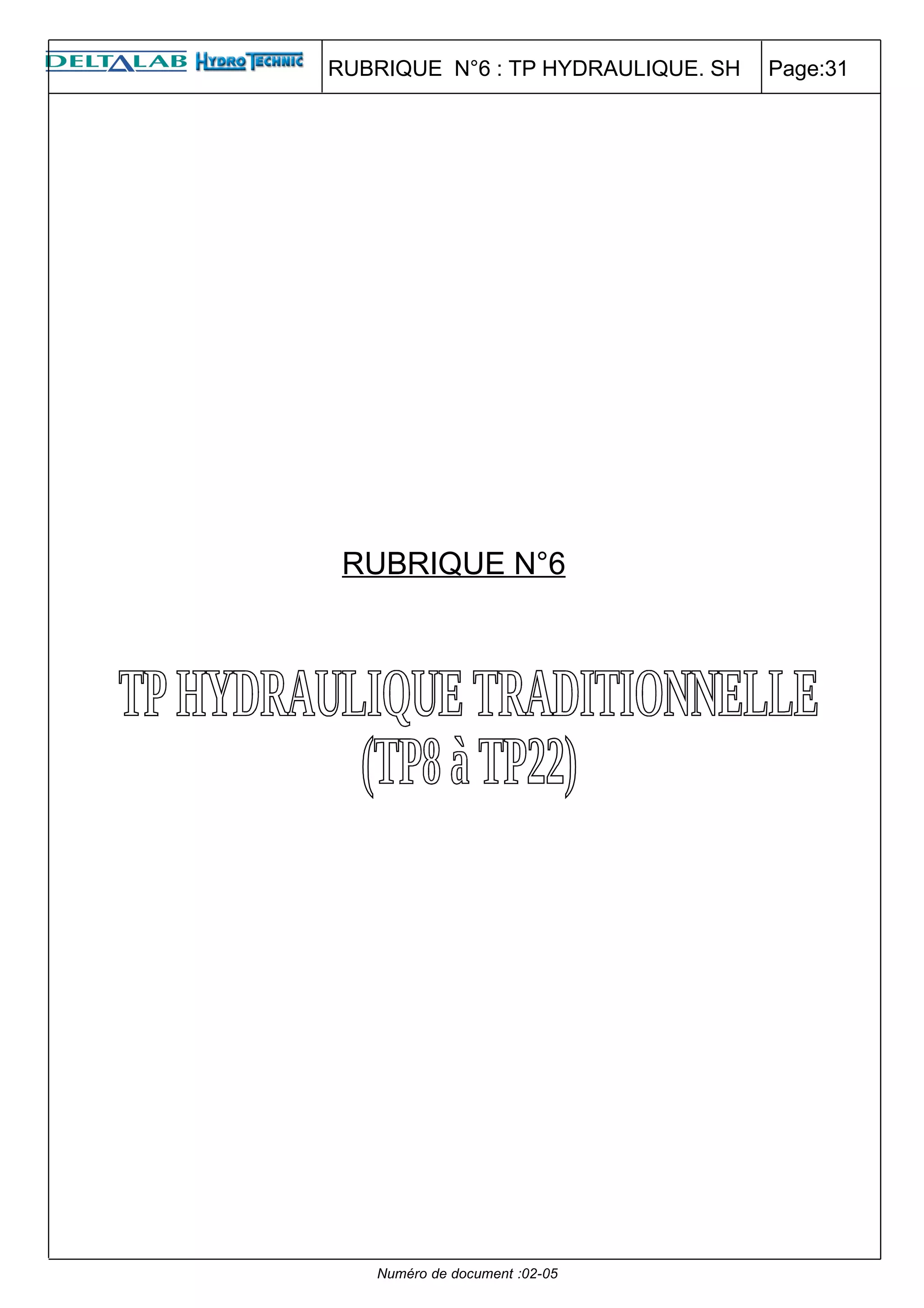 Le document traite des travaux pratiques en hydraulique, couvrant divers composants tels que les vérins, distributeurs et clapets, en présentant des objectifs d'étude, des schémas de principe et des procédures expérimentales. Chaque section détaille les composants nécessaires, les étapes de montage et les précautions à prendre avant d'exécuter les expériences. Les objectifs principaux incluent la compréhension des modes de fonctionnement des dispositifs et la réalisation de mesures précises des pressions, débits et vitesses dans les circuits construits.