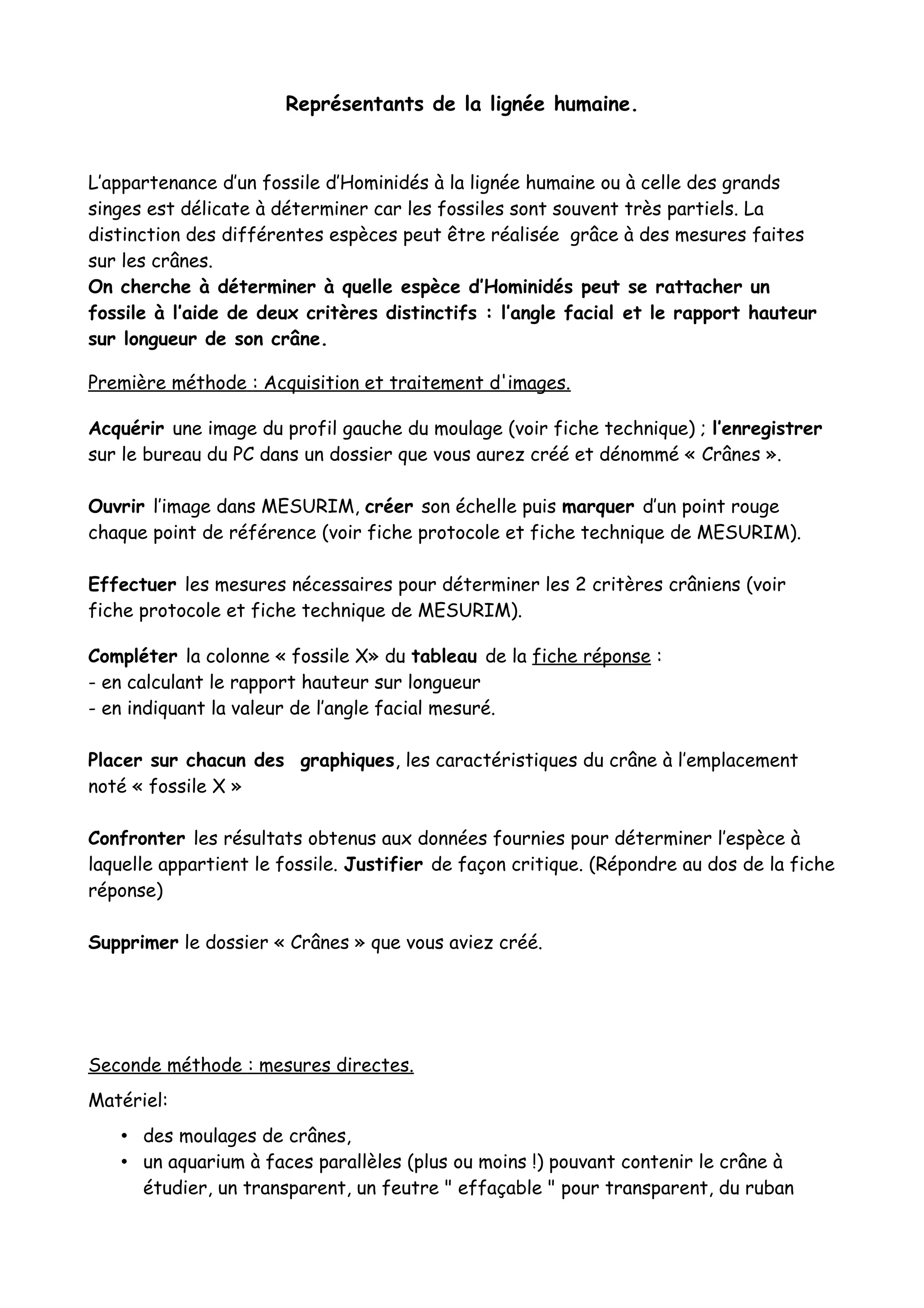 Le document traite de la méthodologie pour déterminer l'appartenance d'un fossile d'hominidés à la lignée humaine par des mesures craniennes. Deux méthodes sont présentées : l'acquisition et le traitement d'images, et les mesures directes des angles et des rapports de longueur. Des instructions détaillées sur la prise de mesures et l'analyse des résultats sont fournies pour comparer les caractéristiques des fossiles avec des données référentielles sur les espèces.