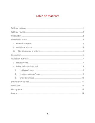 Ce document présente un travail pratique sur la discrimination de textures dans des images en utilisant MATLAB. L'objectif principal est de développer une application permettant à l'utilisateur de sélectionner des zones texturées et de les binariser pour les analyser. Le document détaille les étapes de réalisation, la présentation de l'interface graphique et les résultats obtenus.