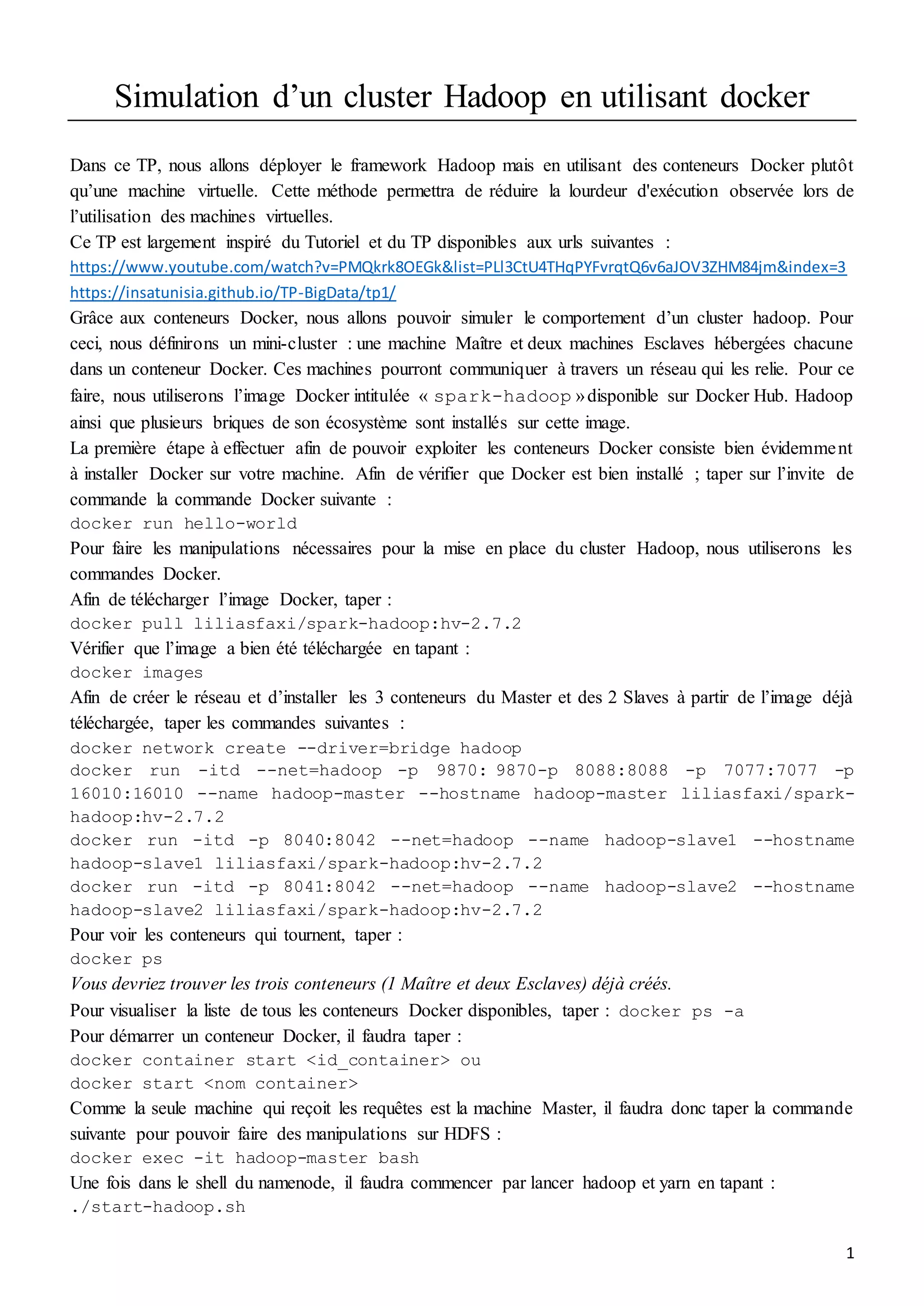 Ce document décrit la simulation d'un cluster Hadoop à l'aide de conteneurs Docker, permettant une exécution plus légère qu'avec des machines virtuelles. Il fournit des instructions détaillées pour déployer un mini-cluster avec une machine maître et deux esclaves, utilisant l'image Docker 'spark-hadoop'. Les étapes incluent l'installation de Docker, le téléchargement de l'image, la création du réseau et le démarrage des conteneurs nécessaires.