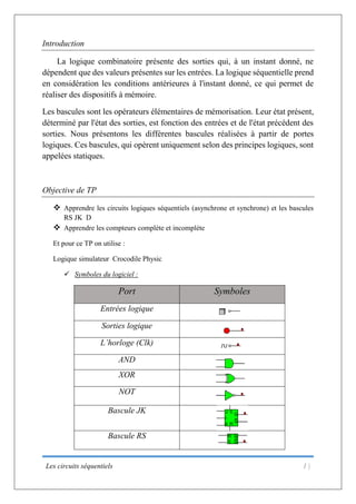 Le document présente un TP sur les circuits séquentiels, traitant des bascules logiques et des compteurs asynchrones et synchrones. Il explique la réalisation de divers montages, notamment les bascules RS et JK, ainsi que leur utilisation dans des compteurs. Les différents tableaux de vérité et chronogrammes permettent de comprendre le fonctionnement de ces circuits logiques.