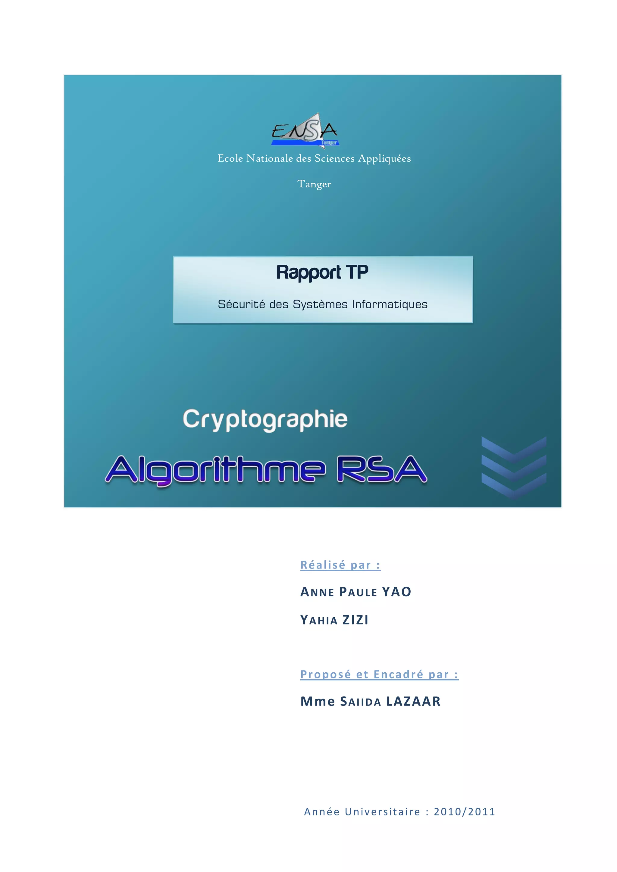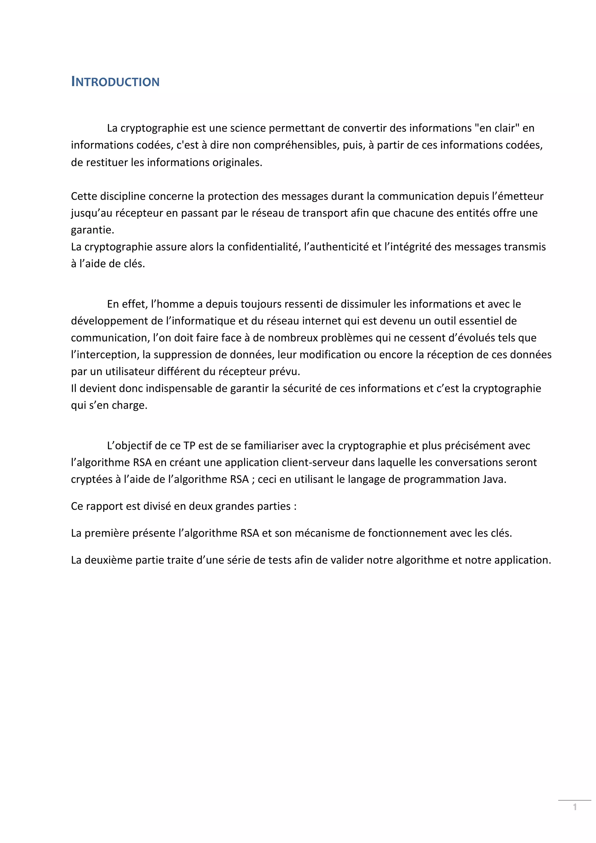 Le rapport présente une étude sur la cryptographie, en se concentrant sur l'algorithme RSA, qui permet de sécuriser les communications en transformant des messages en clair en messages codés. Il détaille le fonctionnement de l'algorithme, les étapes de création des clés, ainsi que les tests réalisés sur une application client-serveur utilisant Java pour chiffrer et déchiffrer des messages. Finalement, il conclut sur l'importance du RSA pour des échanges sécurisés et sur l'acquisition de compétences pratiques en cryptographie.