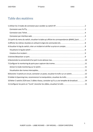 Ce document présente un travail pratique sur la gestion des switchs, incluant l'accès via différents modes de connexion et la configuration de divers paramètres tels que la visualisation des adresses MAC et la création d'incidents. Il décrit également des situations comme la tempête de broadcast et l'activation du protocole Spanning Tree pour résoudre ces problèmes. Les étapes incluent l'utilisation d'interfaces Web, Putty et Telnet pour des configurations avancées.