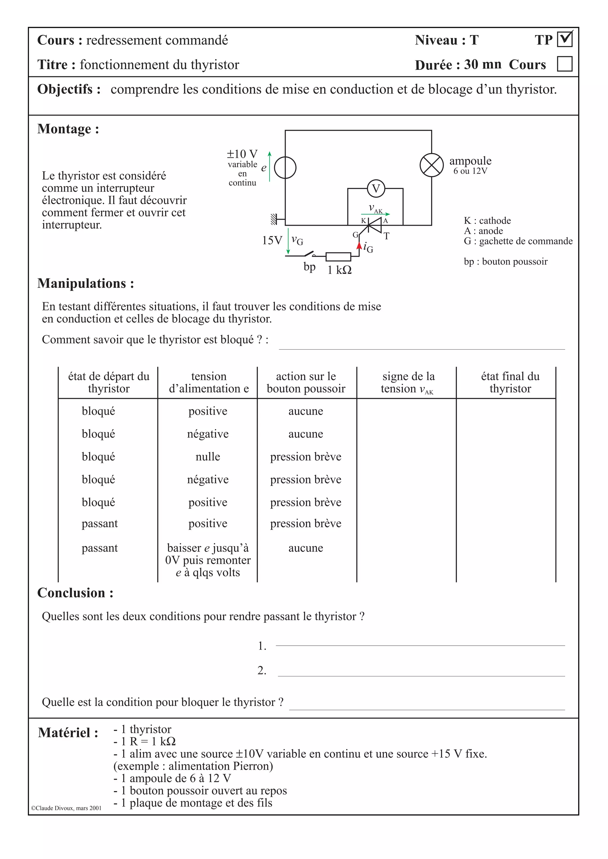 Le document présente un cours sur le fonctionnement du thyristor, visant à identifier les conditions qui le mettent en conduction ou en blocage. Les manipulations pratiques incluent divers tests pour comprendre ces états via un montage électronique. Les deux conditions pour rendre le thyristor passant ainsi que celles pour le bloquer sont également abordées.