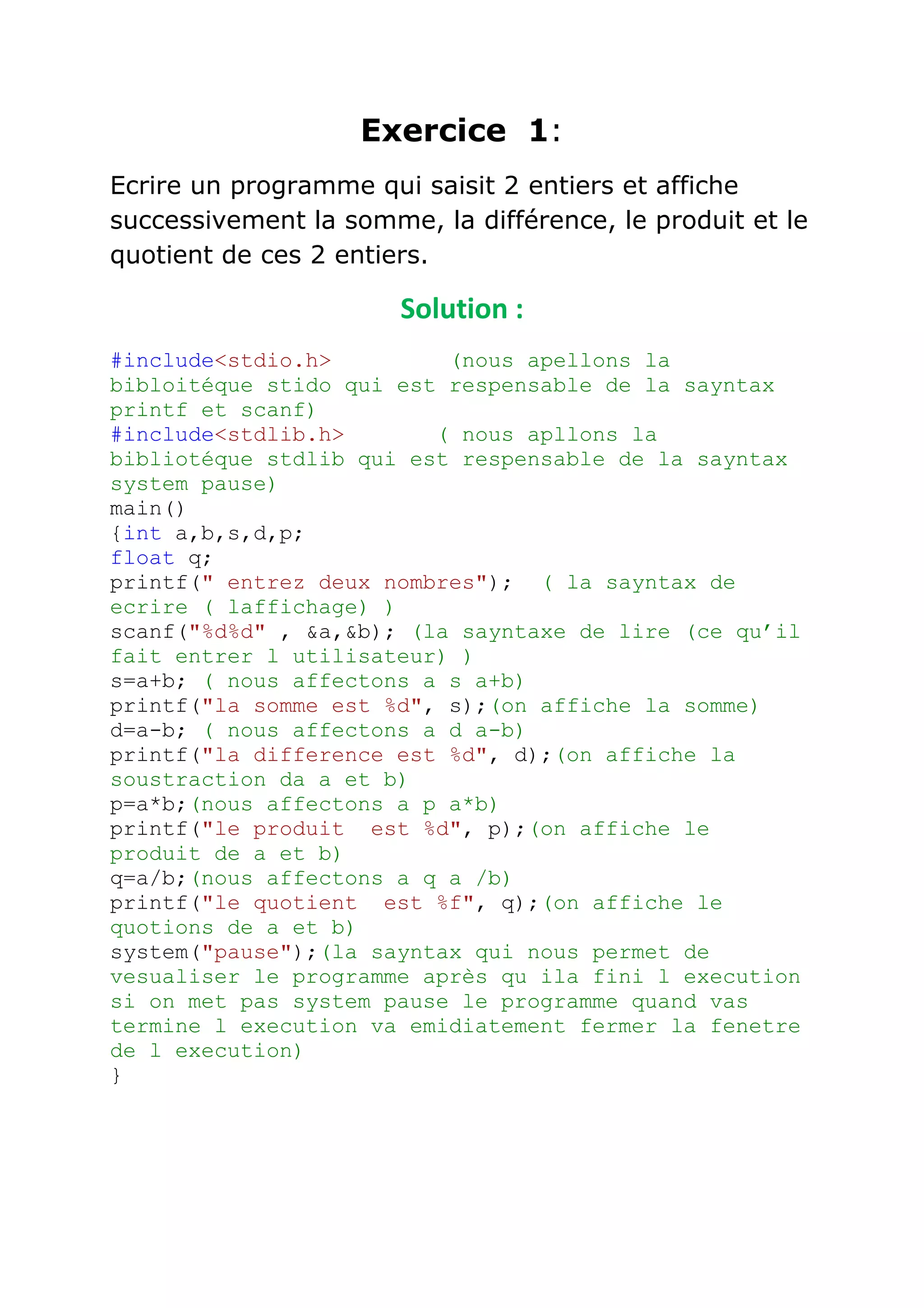 Le document présente plusieurs exercices de programmation en langage C, chaque exercice étant accompagné d'une description et d'une solution sous forme de code source. Les exercices incluent des opérations arithmétiques de base, le calcul de surfaces et périmètres, la permutation de valeurs, l'évaluation de puissances, et le calcul de prix toutes taxes comprises. Chaque solution utilise des bibliothèques standard telles que stdio.h et math.h pour les entrées/sorties et fonctions mathématiques.