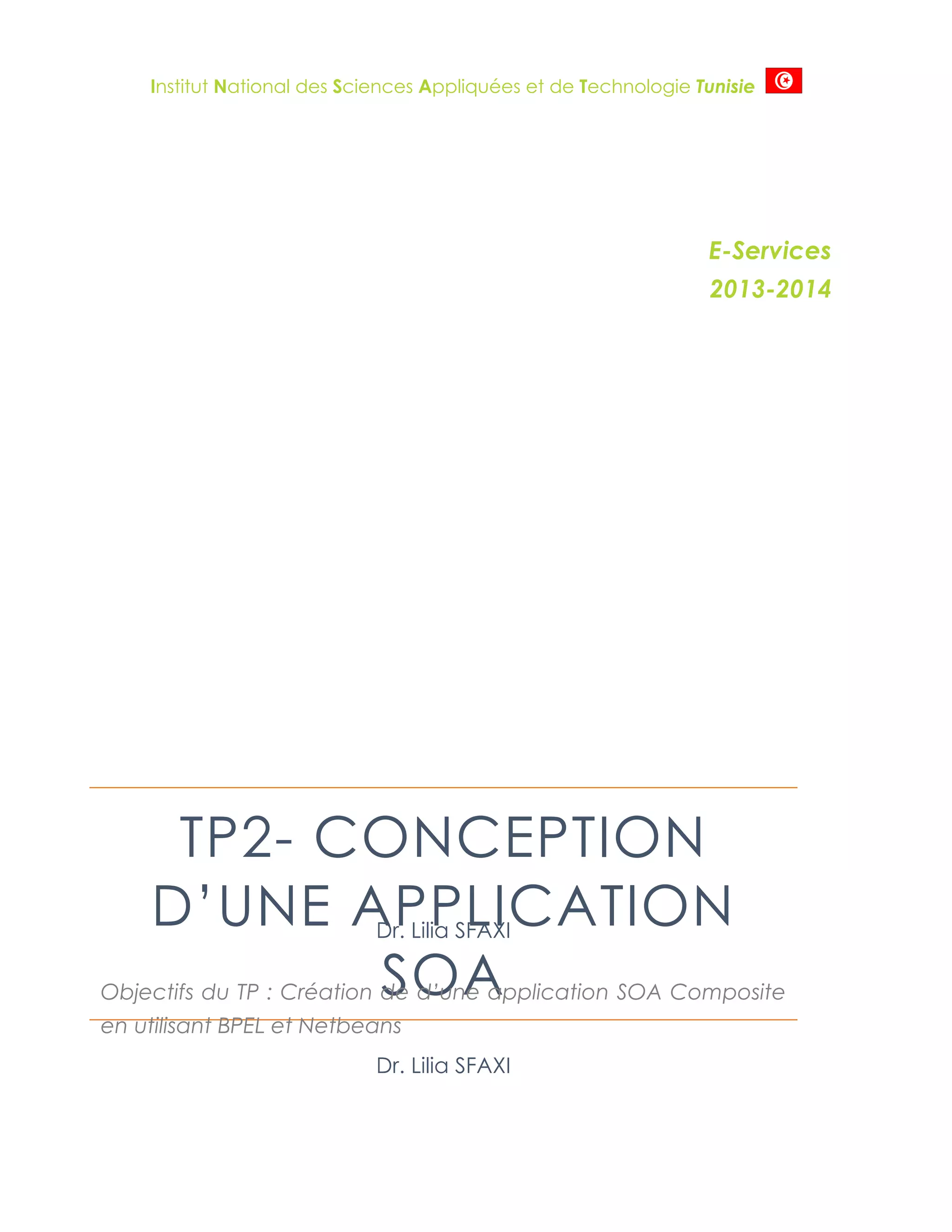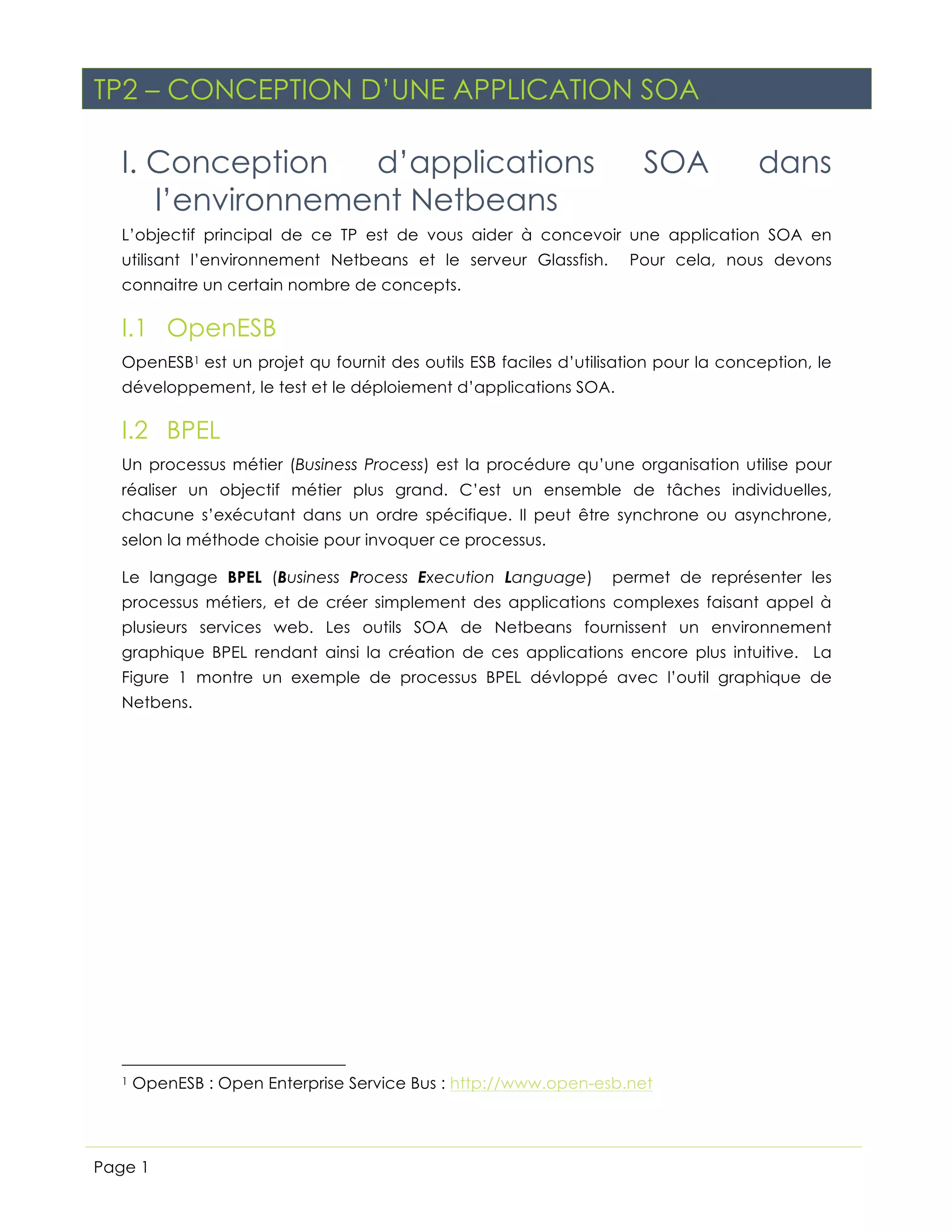 Ce document présente un TP sur la conception d’une application SOA en utilisant BPEL et NetBeans, visant à créer une application composite capable d’invoquer des services externes. Il décrit la définition de processus métiers, la création d'une application SOA simple, ainsi que l'intégration de services web externes pour enrichir la fonctionnalité. Le TP inclut également un exercice pratique sur la soumission d'une demande de prêt via une application SOA.