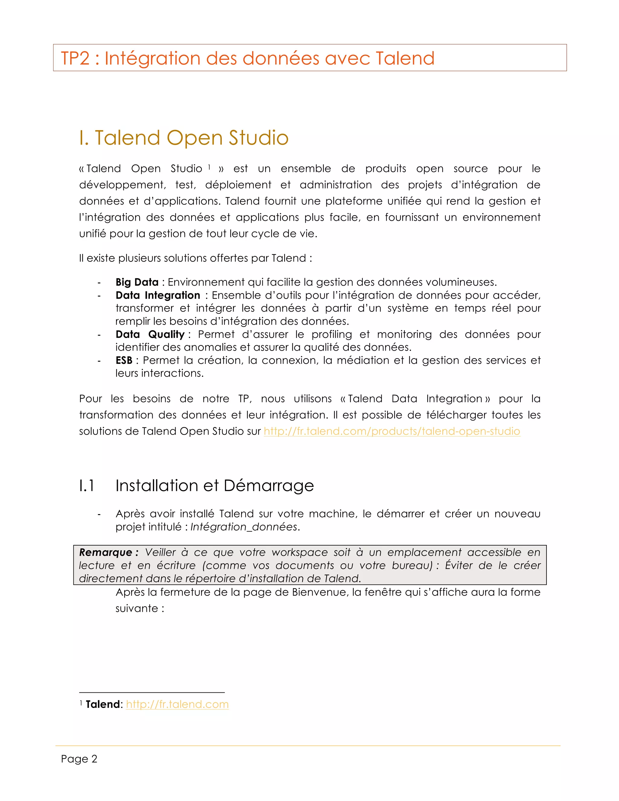 Le document présente un TP sur l'intégration de données utilisant Talend Open Studio, abordant des concepts comme l'extraction et la transformation de données à partir de différentes sources. Il détaille les étapes pour manipuler des fichiers CSV et des bases de données, incluant le tri, la jointure et la sélection des données. Le TP se conclut par un devoir à réaliser à partir des travaux pratiques, axé sur les opérations de jointure et de stockage des données.