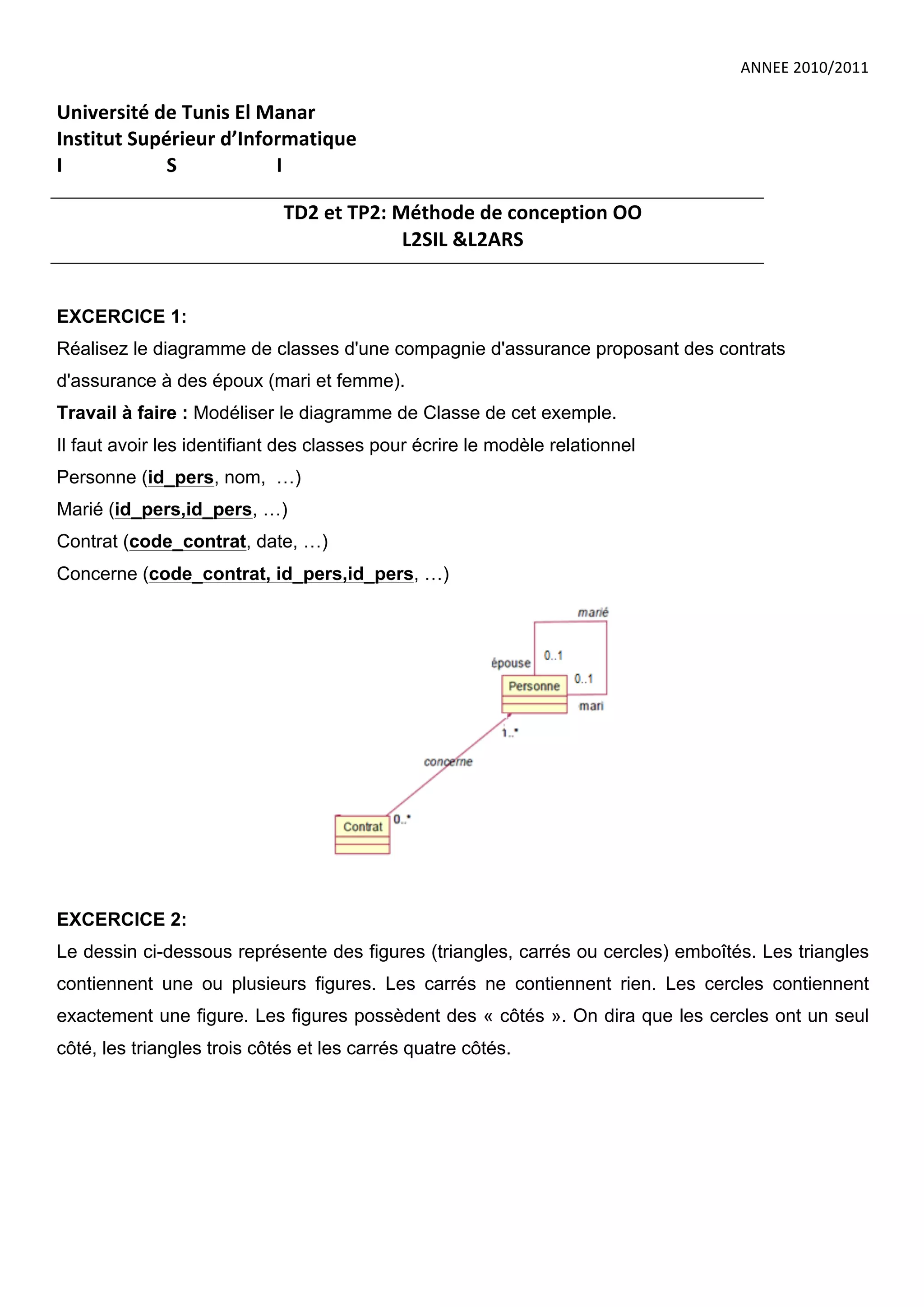 Le document présente plusieurs exercices de modélisation de diagrammes de classes dans divers contextes, tels qu'une compagnie d'assurance, une académie, une société de fabrication de moteurs et des situations impliquant des gangsters. Chaque exercice demande de créer un diagramme de classes avec des spécifications uniques, telles que les relations et les attributs des entités. Les étudiants doivent se concentrer sur l'identification des classes, des associations et des cardinalités appropriées pour chaque scénario proposé.