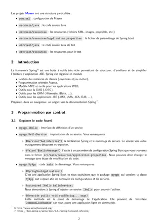 Ce document fournit un guide d'introduction à Spring et à la configuration d'un projet Maven sous Eclipse. Il décrit les étapes pour configurer un projet, utiliser Spring Boot pour la gestion des applications Java EE, et illustre la programmation par contrat à travers des exemples de services loggers. Enfin, il aborde des concepts tels que l'injection de dépendances et l'organisation des projets Maven.