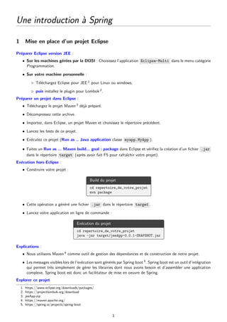 Le document présente une introduction détaillée à la mise en place d'un projet Spring avec Eclipse, incluant les étapes pour installer et configurer les outils nécessaires comme Maven et Lombok. Il décrit également la structure des projets Maven, l'utilisation de Spring Boot pour faciliter le développement et la gestion des dépendances, ainsi que des exemples de code illustrant la programmation par contrat et l'injection de dépendances. Enfin, il propose des exercices et des tests unitaires pour renforcer la compréhension des concepts expliqués.