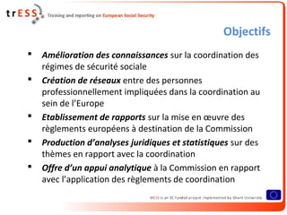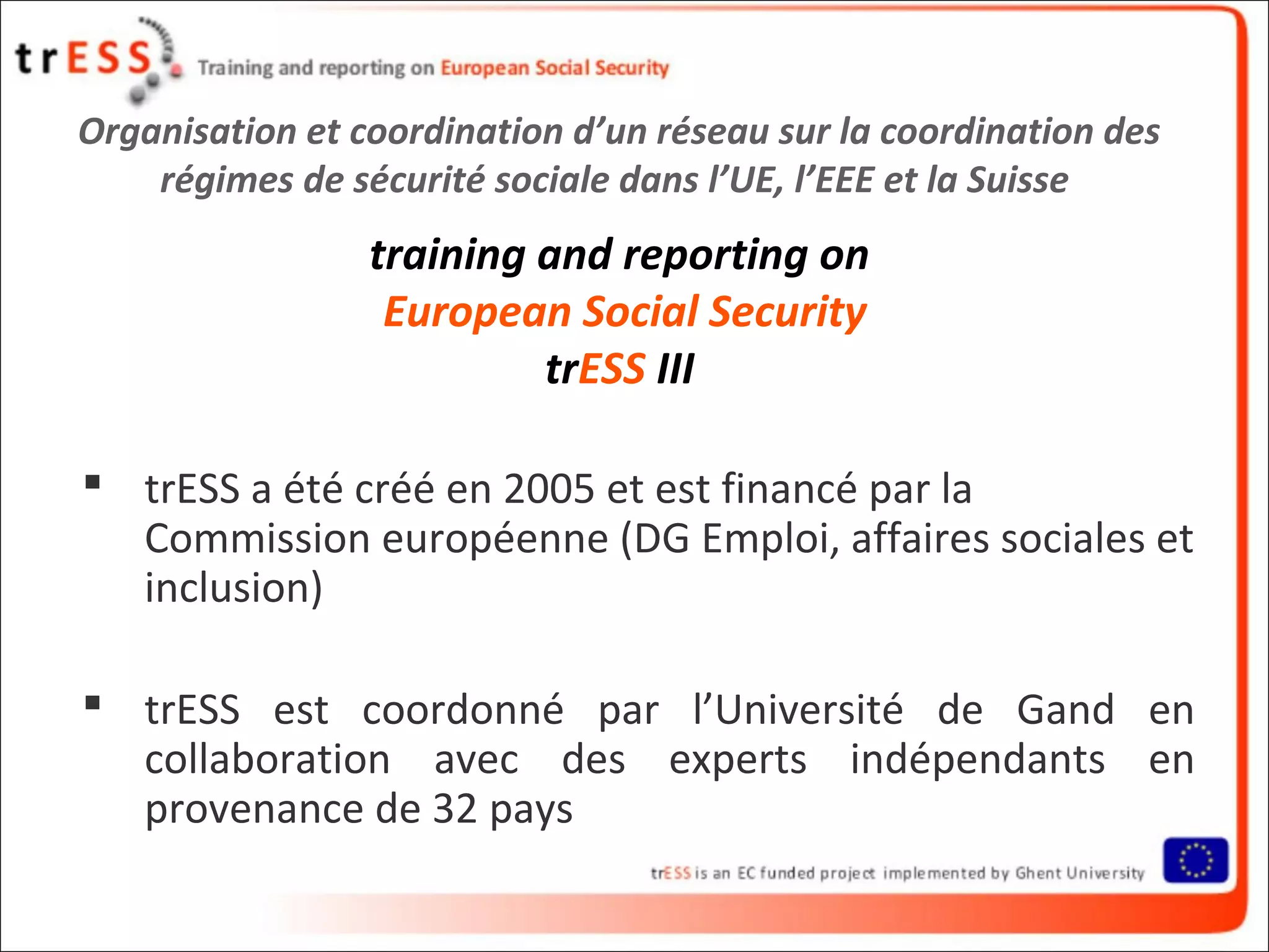 TRESS est un réseau créé en 2005 pour améliorer la coordination des régimes de sécurité sociale en Europe, financé par la Commission européenne et coordonné par l'Université de Gand. Il offre des séminaires spécialisés, des formations, et une analyse juridique pour soutenir la mise en œuvre des règlements européens. Le réseau s'étend à 32 pays, incluant des activités de partage d'informations et de création de réseaux entre professionnels concernés.