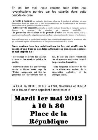 Les organisations syndicales CGT, CFDT, CFTC, FSU, Solidaires et UNSA de la Haute-Vienne appellent à une mobilisation forte le 1er mai 2012 pour exprimer les revendications des travailleurs face à la crise en Europe. Elles insistent sur la nécessité de prioriser l'emploi, la lutte contre la précarité, l'amélioration des salaires et le soutien aux droits fondamentaux. Le syndicat se prononce contre les politiques d’austérité et appelle à une Europe solidaire avec des services publics de qualité.