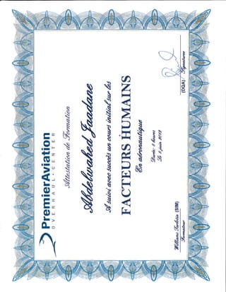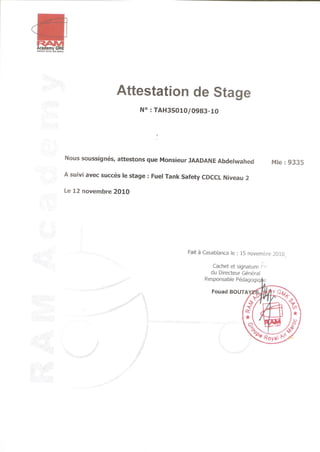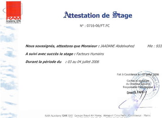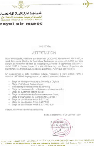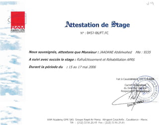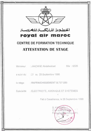 Monsieur Jaadane Abdelwahed a réussi son stage à l'Académie Ramacademy du groupe Royal Air Maroc à Casablanca, avec des attestations datées du 19 mars 2008 et du 4 juin 2008. Les certificats incluent des signatures et des cachets confirmant la réussite du stage à des dates spécifiques. Le document certifie également que le stage concernait l'habilitation après avion.