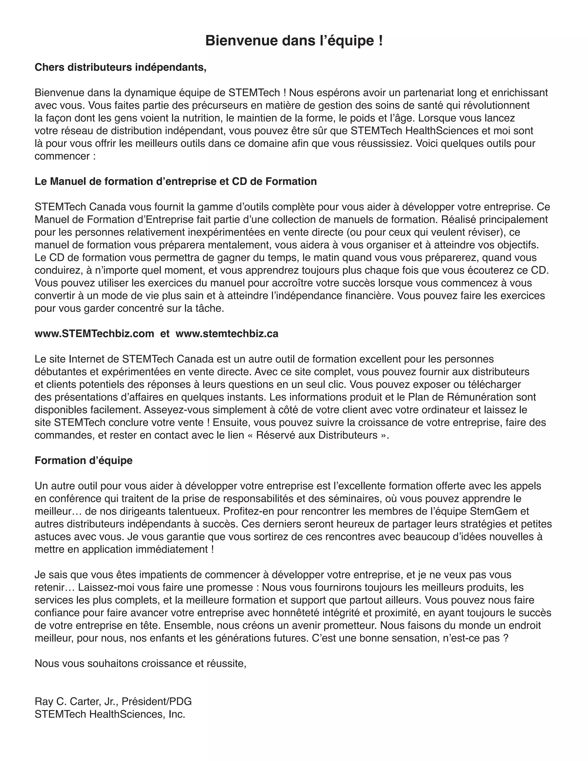Le document accueille les nouveaux distributeurs indépendants de Stemtech, présentant des outils et formations pour les aider à réussir dans la vente directe de produits de santé. Il met en avant des ressources telles que des manuels de formation, des CD, et un site internet pour faciliter l'accès à l'information et améliorer leurs performances commerciales. Le président de Stemtech, Ray Carter, garantit un soutien constant pour favoriser le succès des distributeurs et promouvoir une vision positive de la santé et de la nutrition.
