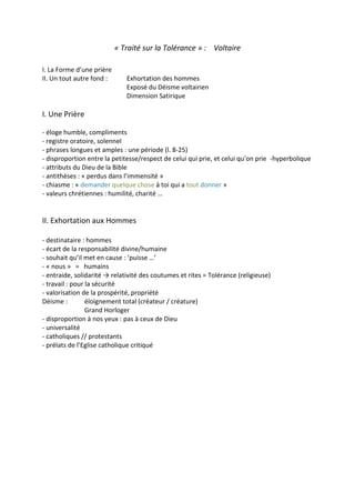 Le document traite de la tolérance à travers l'œuvre de Voltaire, présentant une prière qui souligne l'humilité et l'entraide entre les hommes. Il aborde également la notion de déisme, mettant en lumière la distance entre le créateur et la créature, ainsi que la nécessité de la solidarité et de la tolérance religieuse. Enfin, il critique les divergences entre catholiques et protestants et remet en question les institutions religieuses.