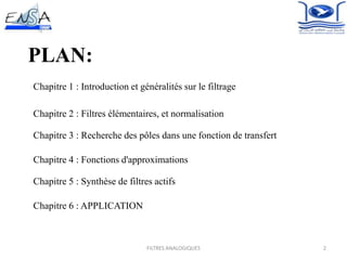 Le document traite des filtres analogiques, incluant leurs types, propriétés, et applications, structuré en plusieurs chapitres. Il aborde les concepts fondamentaux comme les fonctions de transfert, la normalisation, et les différentes approximations de filtres. Enfin, il présente des exemples pratiques de synthèse de filtres actifs, en se concentrant sur un projet de conception de filtre passe-bas.