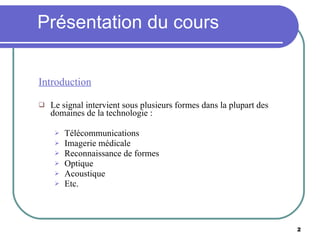 Le document présente un cours de traitement du signal, abordant la modélisation, la représentation et l'analyse des signaux, ainsi que leurs applications dans des domaines variés comme les télécommunications et l'imagerie médicale. Il couvre des notions fondamentales telles que les classifications des signaux (déterministes, aléatoires, continus, discrets) et les techniques de traitement qui incluent la création, l'analyse et la transformation des signaux. Enfin, il introduit des concepts clés comme l'autocorrélation et l'intercorrélation pour mieux comprendre la dynamique des signaux dans le temps.