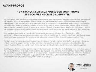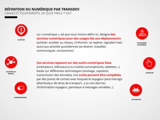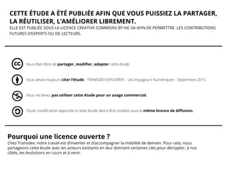 Le document présente Transdev Explorer, un projet collectant des données agrégées d'une étude en creative commons. Il remercie les voyageurs, les réseaux et les partenaires ayant contribué. Les réactions peuvent être partagées avec le hashtag #transdevexplorer.