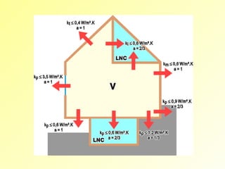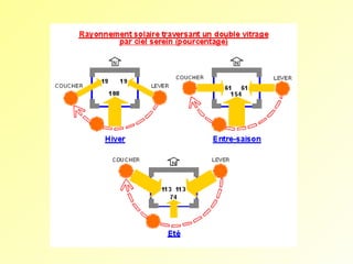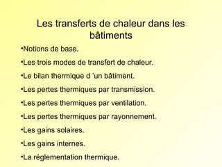 Le document traite des calculs thermiques liés à la performance énergétique des bâtiments, incluant des coefficients de transmission thermique et des pertes thermiques par ventilation. Il aborde également les gains solaires en fonction de divers facteurs, tels que l'orientation et les matériaux, ainsi que les réglementations thermiques à respecter pour le logement neuf. Enfin, il mentionne des méthodes de simulation pour évaluer les performances énergétiques des bâtiments.