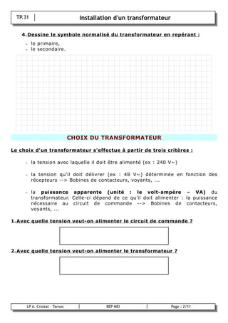 Ce document traite de l'installation d'un transformateur pour une installation électrique, en abordant le choix, le câblage et les protections nécessaires. Il décrit les paramètres à prendre en compte pour sélectionner le transformateur approprié, ainsi que les méthodes de détermination de la puissance d'appel. Enfin, il souligne l'importance des protections contre les courts-circuits avec des exemples pratiques et des schémas de câblage.