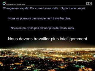Le document aborde la nécessité de transformer la collaboration et les processus en réponse aux disruptions de marché et à la concurrence. Il met en évidence l'importance d'utiliser la technologie pour améliorer la flexibilité organisationnelle, optimiser les performances et réduire les inefficacités, tout en facilitant la collaboration en temps réel. Enfin, il souligne l'importance de développer des processus dynamiques, intelligents et automatisés pour s'adapter aux besoins métier rapidement et efficacement.