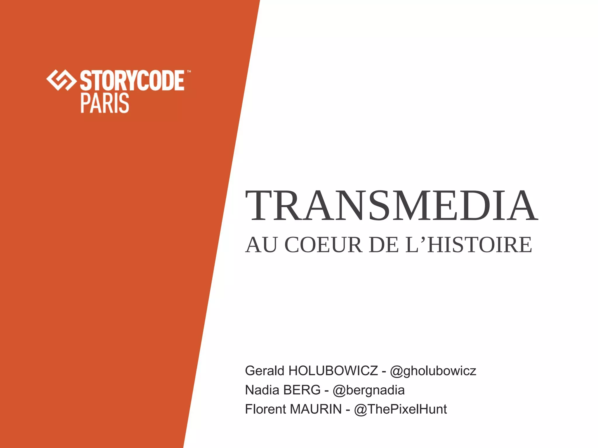 Le document traite du transmedia storytelling, une méthode de narration qui utilise plusieurs plateformes pour raconter une histoire de manière immersive. Il présente des définitions et concepts clés, ainsi que des exemples de franchises transmedia, tout en soulignant l'importance d'une histoire forte et d'une relation engagée avec le public. Les acteurs du transmedia et les principes d'engagement sont également abordés pour illustrer les dynamiques de création et de partage au sein de ces univers narratifs.