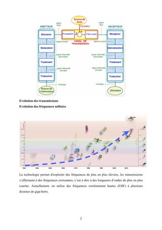Le document traite des modes et techniques de transmission d'informations, expliquant les rôles de l'émetteur, du canal et du récepteur. Il couvre l'évolution des supports de transmission, y compris les câbles coaxiaux, la fibre optique et les transmissions sans fil, ainsi que leurs caractéristiques telles que la bande passante et les interférences. Enfin, il aborde les équipements de transmission comme les modems et les différentes configurations de circuits de données.