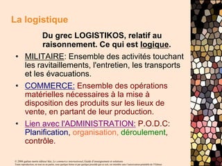 Le document traite de la logistique du transport dans le commerce international, mettant en avant l'importance de la gestion des chaînes d'approvisionnement et des différents modes de transport, tels que maritime, routier, aérien et ferroviaire. Il aborde également les critères de choix de mode de transport, les avantages et inconvénients de chaque méthode, ainsi que l'importance d'un bon emballage pour assurer la sécurité des marchandises. Enfin, il souligne la nécessité d'une coordination efficace entre les transporteurs et les clients pour garantir la satisfaction client et établir des relations d'affaires durables.