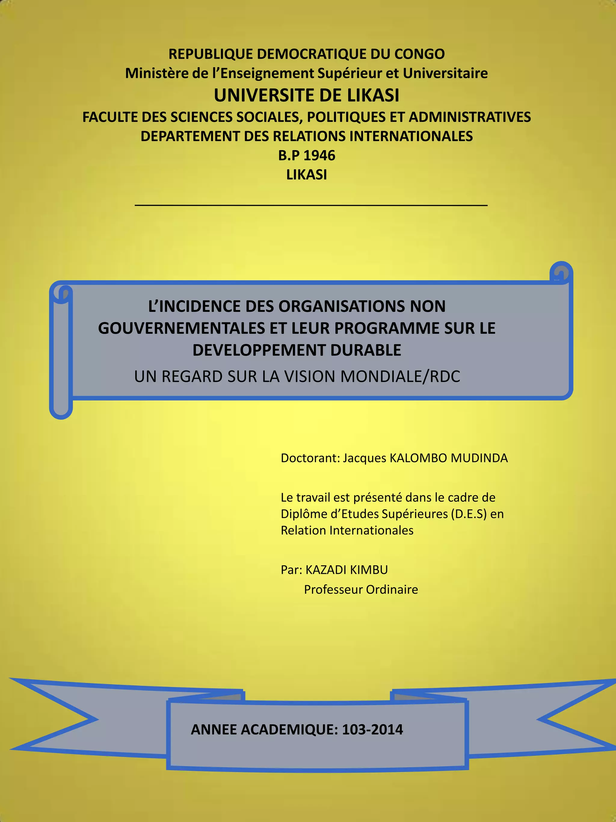 Le document examine l'impact des organisations non gouvernementales, notamment Vision Mondiale, sur le développement durable en République Démocratique du Congo. Il aborde les défis du pays en matière d'éducation et de santé, et souligne l'importance de l'engagement des ONG pour promouvoir un développement social intégré. Les recherches mettent en lumière la nécessité d'une stratégie politique pour renforcer le rôle de ces organisations dans l'avenir du pays.