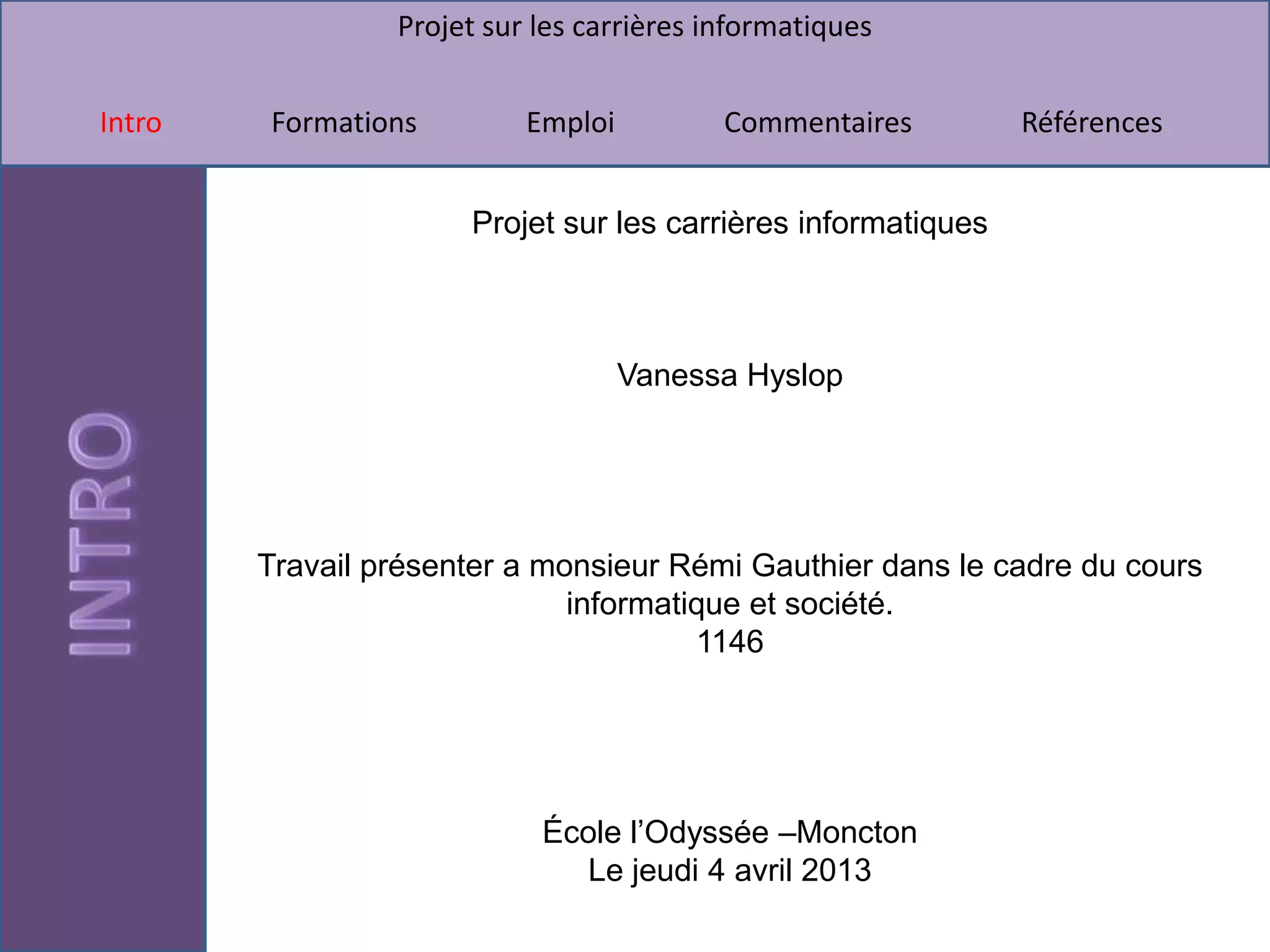 Le document présente un projet sur les carrières informatiques, y compris les formations requises et les perspectives d'emploi au Nouveau-Brunswick. Il décrit plusieurs métiers, tels que techniciens de réseau et techniciens en génie électronique, ainsi que les salaires associés et les prérequis pour chaque formation. Des références à des ressources en ligne sur l'éducation et le marché du travail au Canada sont également incluses.