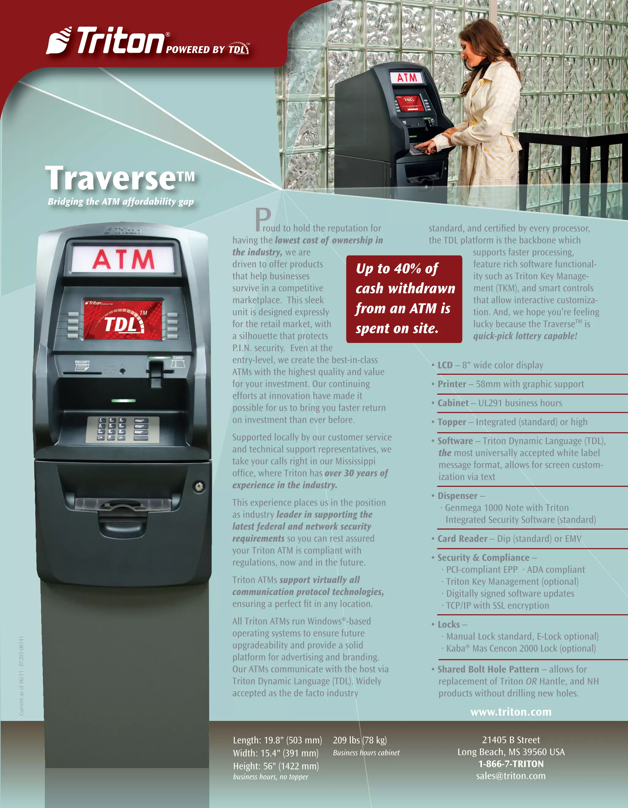 Le document présente le guichet automatique TraverseTM, reconnu pour son coût de possession bas et certifié par tous les processeurs. Il met en avant des fonctionnalités avancées telles que la gestion de clé, des contrôles intelligents et une compatibilité avec diverses technologies de communication. La plateforme assure également une conformité aux normes de sécurité actuelles et futures, tout en offrant un excellent retour sur investissement pour les entreprises.