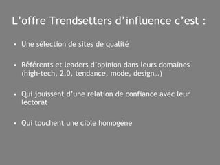 Le document présente une sélection de sites influents ciblant une audience jeune, masculine et aisée, orientée vers les produits high-tech et culturels. Il met en avant divers blogs et plateformes, tels que le Journal du Geek et TechCrunch, qui se concentrent sur l'actualité technologique et les tendances. De plus, il décrit des formats publicitaires innovants, tels que les widgets et le publirédactionnel, qui visent à intégrer la publicité de manière non intrusive.