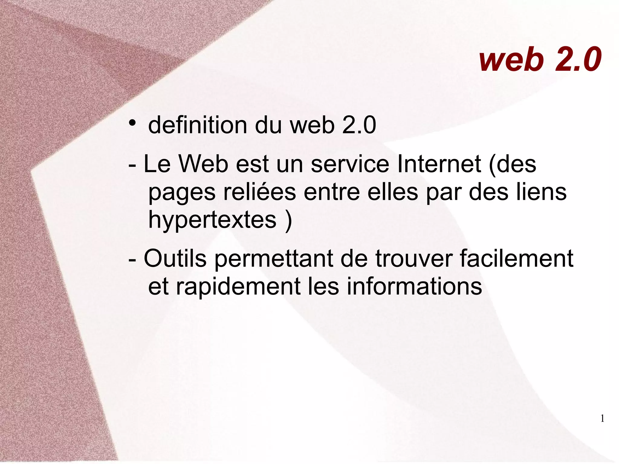 Le document définit le Web 2.0 comme un service Internet facilitant l'accès rapide aux informations et la collaboration. Il présente les avantages, tels que le partage et l'amélioration de la qualité du travail, ainsi que les inconvénients, incluant des problèmes de sécurité, de plagiat et une surcharge d'informations. Enfin, il évoque un projet d'intégration des TIC dans l'élaboration de cours et la recherche.