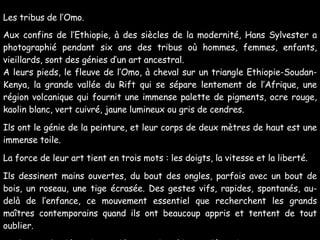 Hans Silvester a passé six ans à photographier les tribus de l'Omo en Éthiopie, révélant leur art ancestral à travers des pigments naturels. Les membres de ces tribus utilisent des gestes vifs et spontanés pour se décorer, transformant leurs corps en toiles vivantes. Leur créativité incarne un désir de beauté et un plaisir ludique, rappelant les techniques de grands maîtres contemporains.