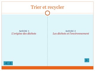 Le document aborde le tri et le recyclage des déchets, en proposant des activités interactives sur les catégories de déchets. Il explique les différentes classifications telles que les matières recyclables, matières organiques, déchets dangereux, encombrants et déchets ultimes. De plus, il met en avant la durée de décomposition de divers objets, illustrant l'impact environnemental des déchets.