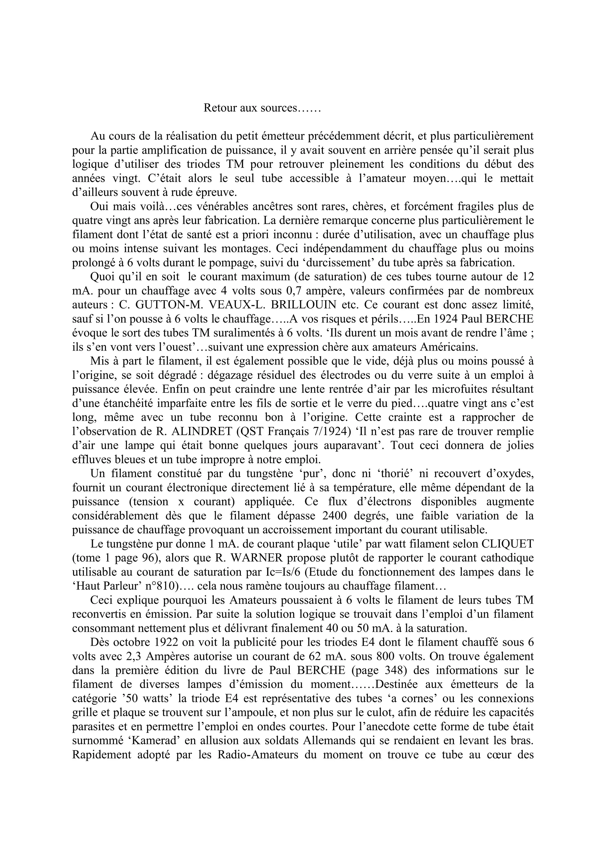 Le document traite des défis de la conception et de l'utilisation des triodes antiques dans des émetteurs radio, en mettant l'accent sur les limitations dues à l'état du filament et au vide interne. Il évoque l'évolution des tubes, les choix de matériaux, et l'importance du chauffage adéquat pour obtenir des performances optimales. L'auteur souligne également la valeur des travaux passés et la nécessité de comprendre les techniques historiques pour éventuellement reproduire des tubes performants.