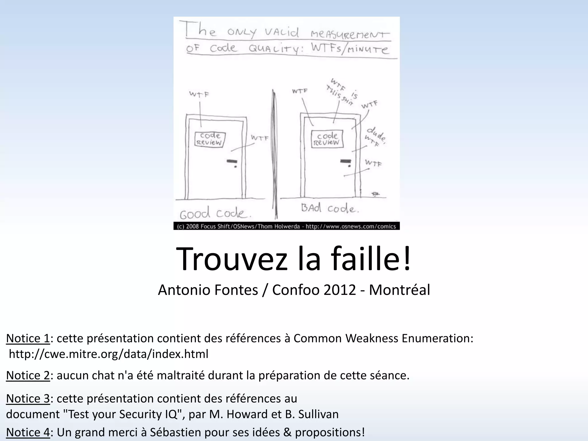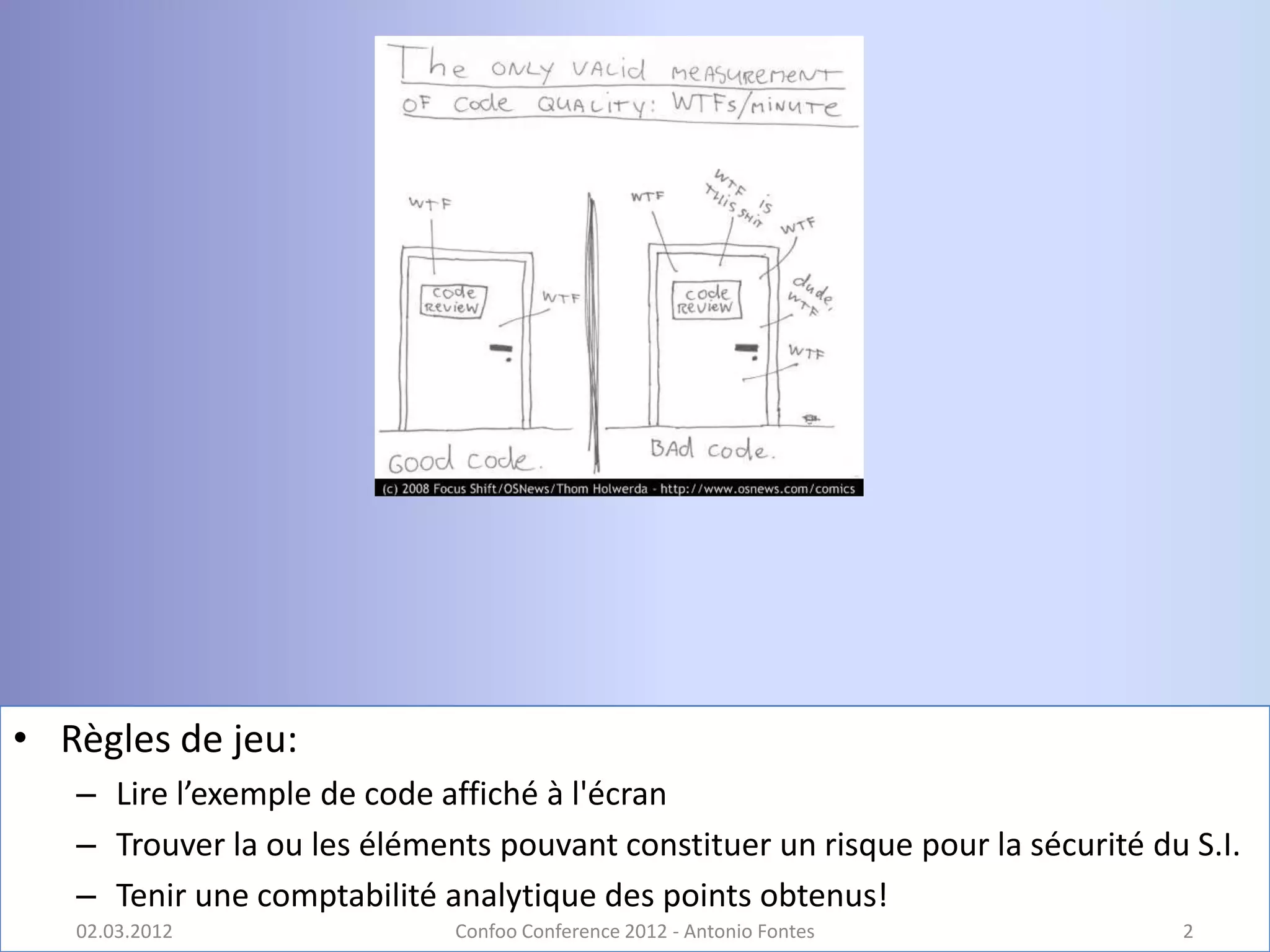 La présentation d'Antonio Fontes aborde diverses failles de sécurité à travers des exemples de code, mettant en évidence des risques comme l'envoi d'authentification en clair, l'injection SQL et le manque de contrôle d'accès. Le document propose un jeu interactif où les participants identifient et score les vulnérabilités dans le code. Fontes souligne l'importance de la sécurité des applications web et les recommandations à suivre pour éviter ces vulnérabilités.