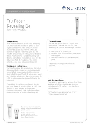 Le Tru Face Revealing Gel de Nu Skin est un soin anti-âge formulé avec des acides polyhydroxy pour éliminer les impuretés et offrir un teint éclatant sans irriter la peau. Il hydrate et fournit des antioxydants puissants, tout en stimulant le renouvellement cellulaire pour réduire les signes de vieillissement. Ce produit se positionne comme un précurseur d'une nouvelle génération de soins de la peau.