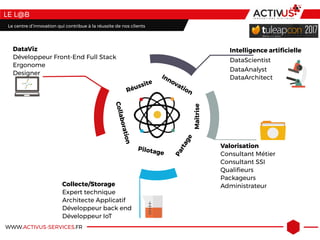 Le document traite de l'importance de la dataviz dans le pilotage agile et présente divers services et outils proposés par Activus Services, comme Microsoft Power BI. Il mentionne également des compétences et professions impliquées dans la dataviz, ainsi qu'un centre d'innovation pour aider les clients. Des démonstrations en direct de Power BI et des ressources pour la préparation et la modélisation des données sont également mises en avant.