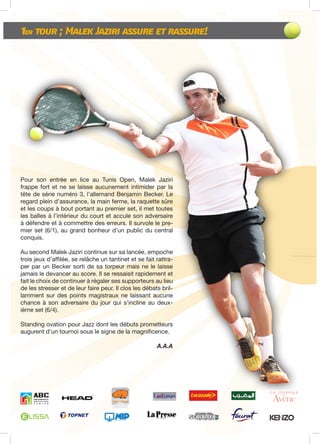 Le Tunis Open 2013 voit Malek Jaziri impressionner en battant le tête de série Benjamin Becker avec des performances remarquables. Haythem Abid, malgré des douleurs au dos, se bat honorablement contre un adversaire mieux classé, tandis que Lamine Ouahab réalise une belle surprise en éliminant Nicolas Mahut. Tunisie Telecom, partenaire de l'événement, renforce son engagement dans le soutien sportif en Tunisie.