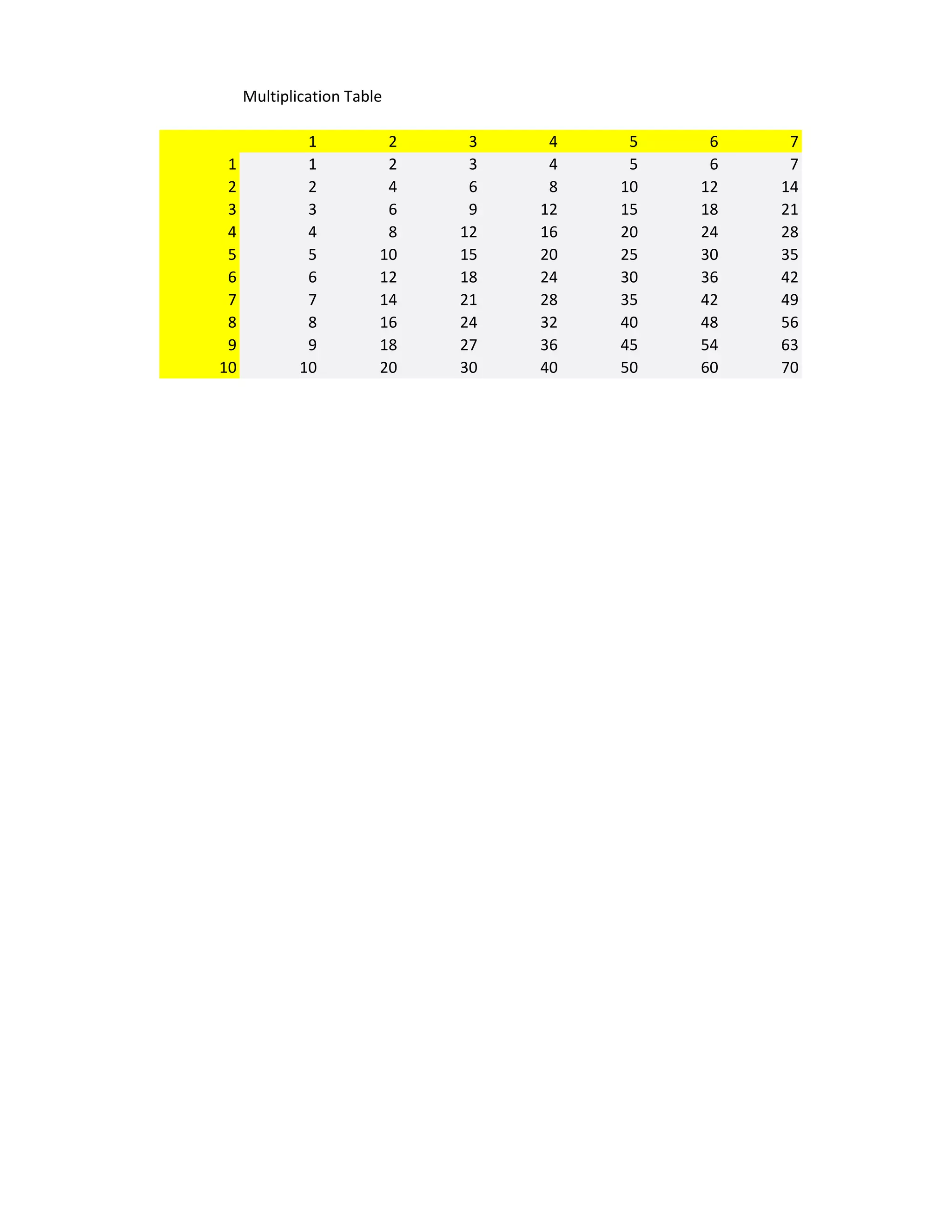 Le document présente une table de multiplication comprenant les produits des nombres de 1 à 10. Chaque ligne montre le résultat de la multiplication d'un nombre par les nombres de 1 à 10. Il s'agit d'un outil éducatif utilisé pour aider à l'apprentissage des multiplications.